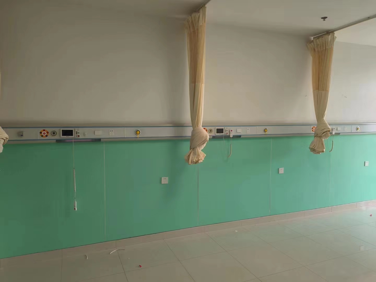 病房床頭醫(yī)療設(shè)備帶安裝有病房氧氣維修閥門、漏電保護(hù)器、氧氣終端、負(fù)壓吸引終端、床頭燈、五孔插座、電源開關(guān)及呼叫對(duì)講分機(jī)等。